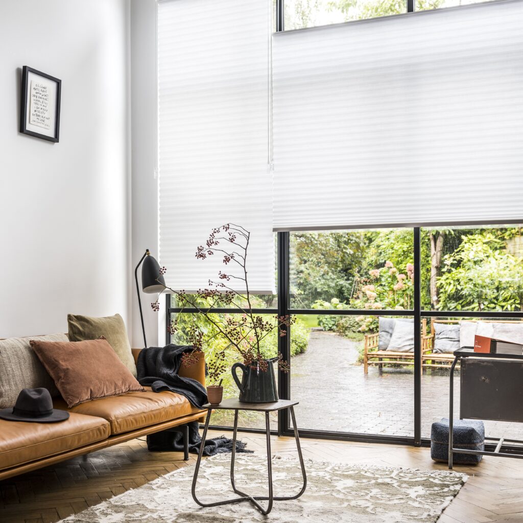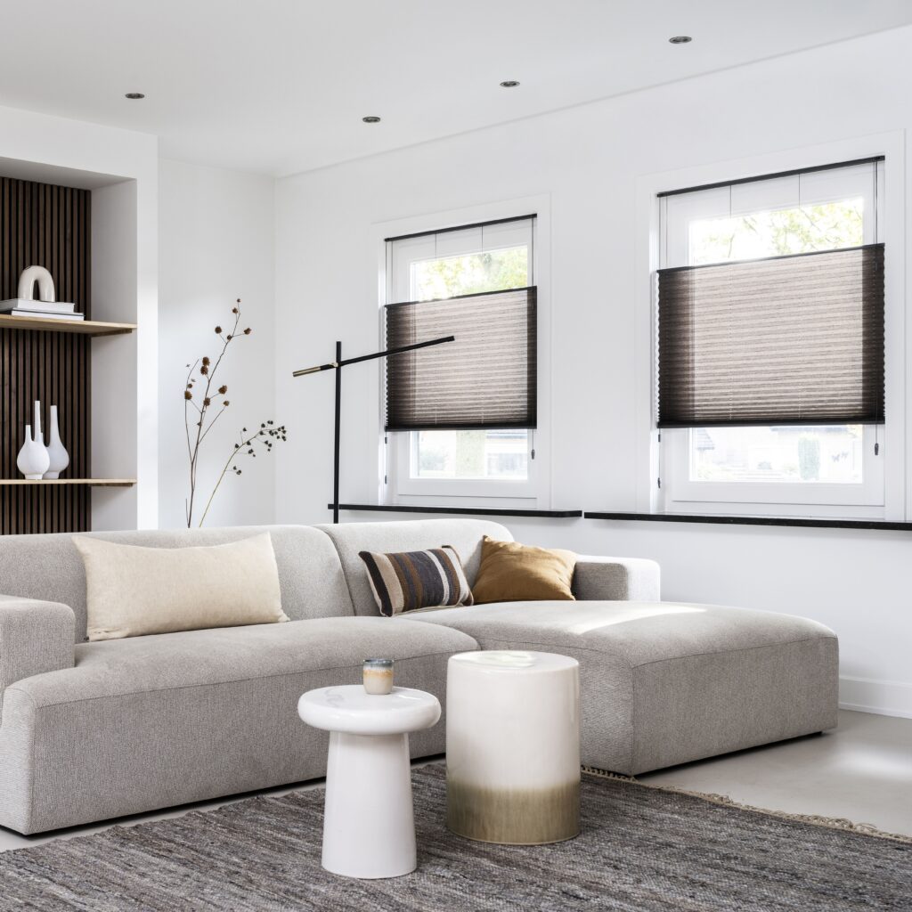 Plisségardiner gir effektiv og moderne solskjerming med isolerende og lyddempende effekt.